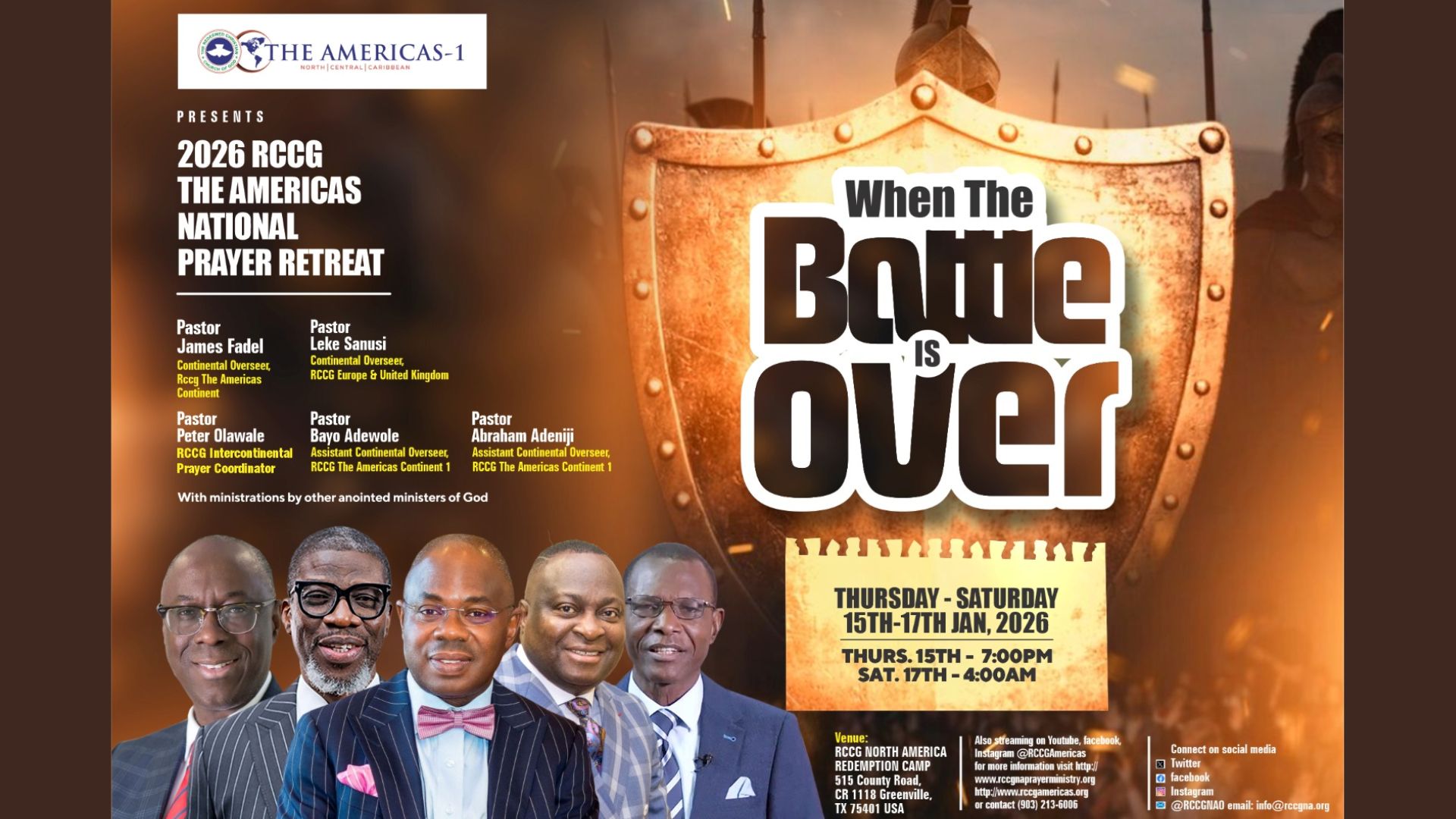 January 15, 2026 @ 7:00 pm - January 17, 2026 @ 4:00 am RCCG The Americas National Prayer Retreat Redemption Camp, Greenville, TX January 15-17, 2026